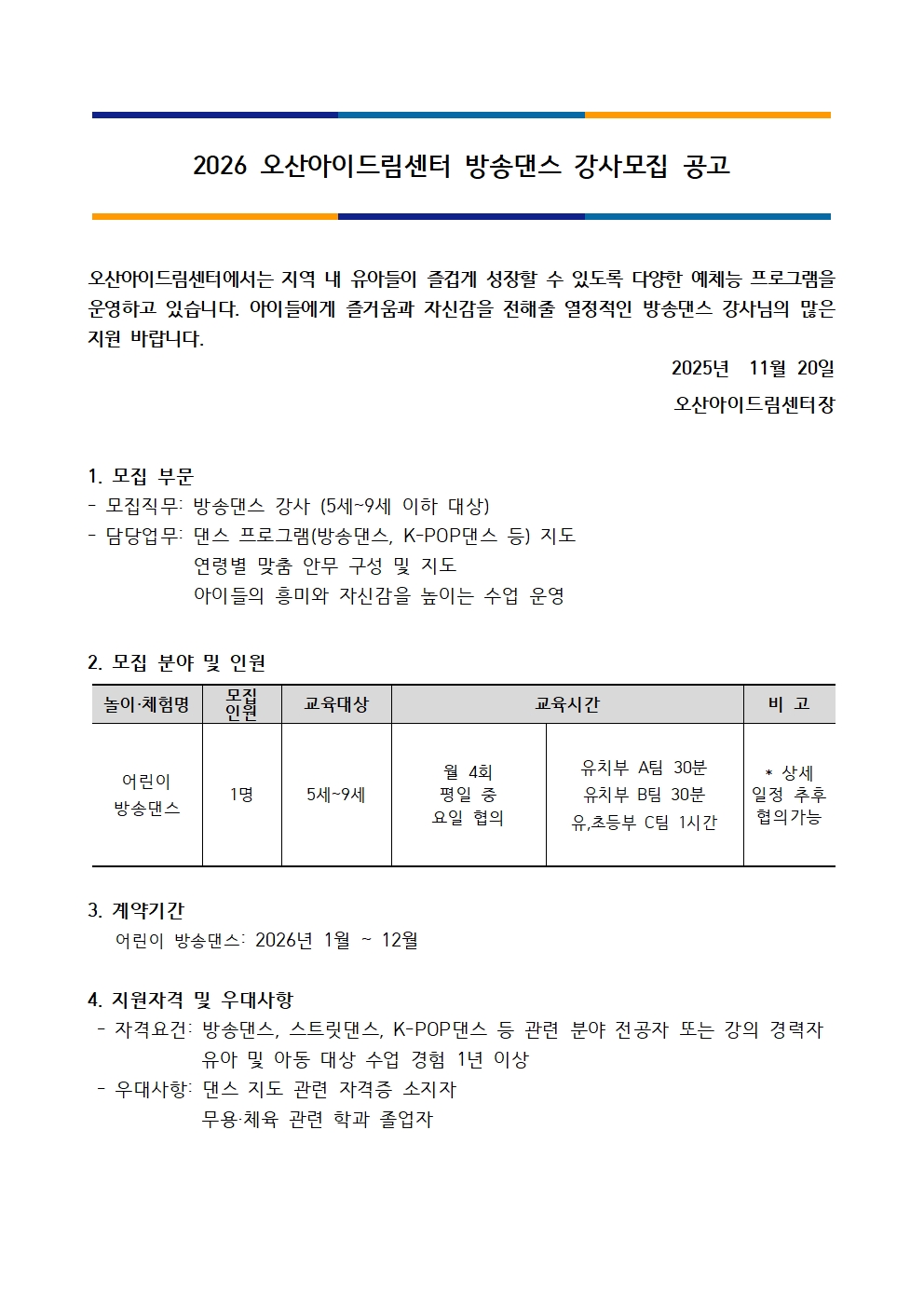 [공지] [오산아이드림센터] 놀이체험사업 - 방송댄스 교육강사 채용 공고
